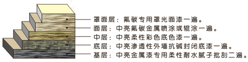 采用氟碳樹脂與閃光金屬漆粉制成的氟碳金屬漆,用噴涂輥涂而成信各色鋁塑板的金屬面效果,它主要用在需耐久性高的高檔外墻面裝飾上,漆膜堅韌,抗紫外線,防腐蝕性強,不沾灰,清洗保養(yǎng)非常方便,保護外墻面免受碳化,是高檔外墻裝飾的非常理想選材。